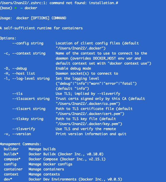 설치 완료 후, 터미널에서 docker 명령어로 설치가 제대로 되었는지 확인
