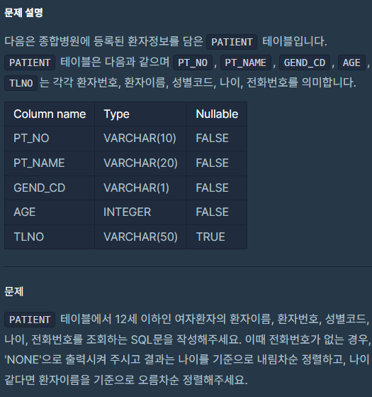 SELECT PT_NAME, PT_NO, GEND_CD, AGE, IFNULL(TLNO, "NONE")