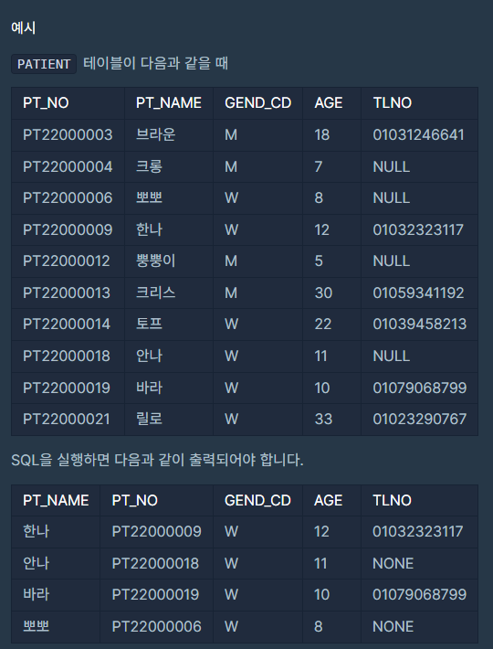 [프로그래머스/SELECT] 12세 이하인 여자 환자 목록 출력하기 본문