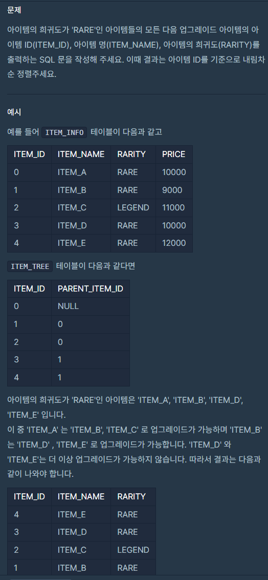 처음에는 단순히 부모 ID값이 NULL이 아니며, 희소성이 RARE인 아이템들이 나올 것이라 생각했다.