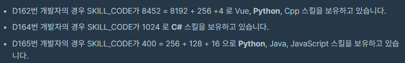 Skill_Code 열의 비트를 사용해서 각 Python과 C# 스택을 가진 개발자를 찾는다.