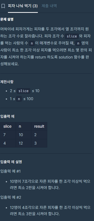 나머지가 0이 아닌 경우, 피자 1판을 추가한 몫 + 1을 반환한다.