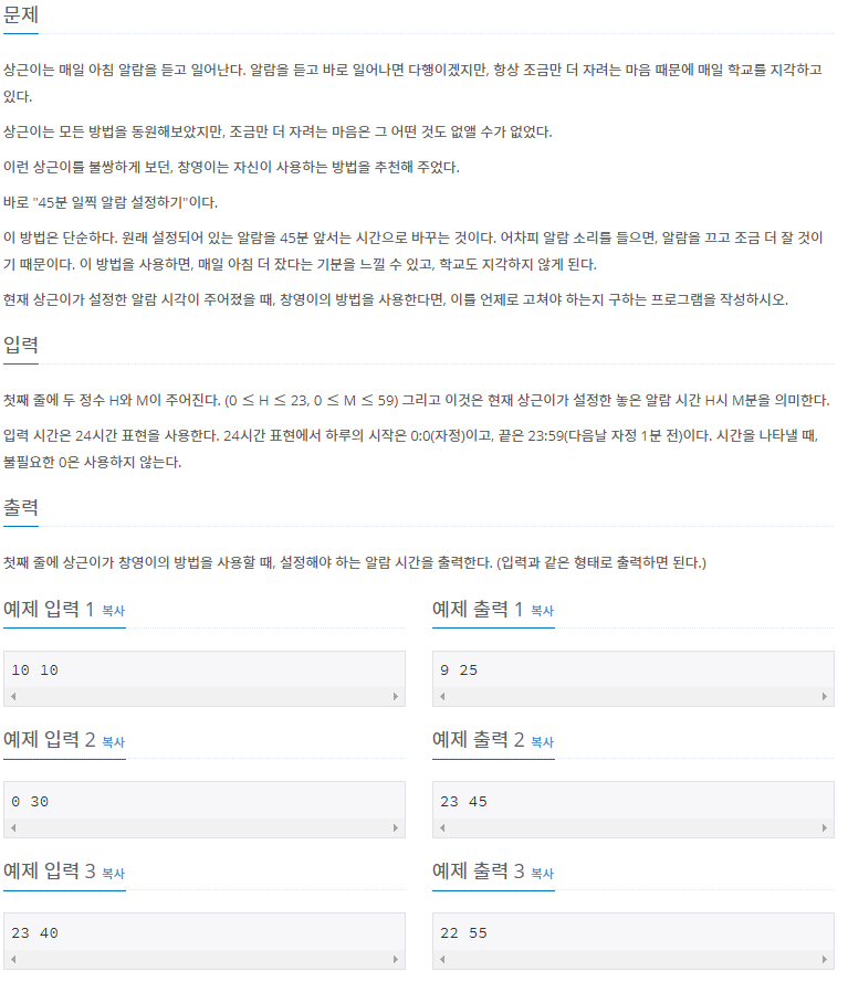 상근이는 매일 아침 알람을 듣고 일어난다. 알람을 듣고 바로 일어나면 다행이겠지만, 항상 조금만 더 자려는 마음 때문에 매일 학교를 지각하고 있다. 상근이는 모든 방법을 동원해보았지만,
