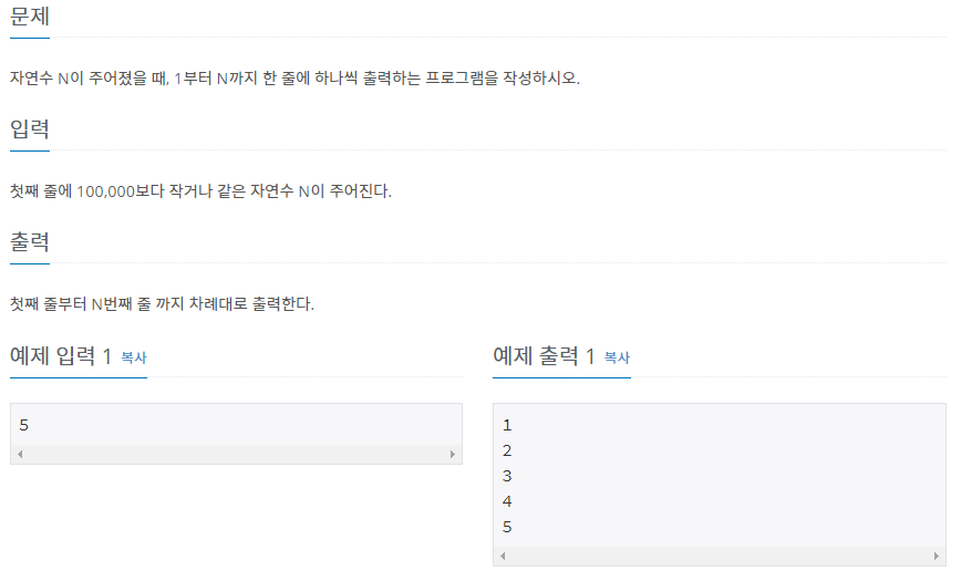 자연수 N이 주어졌을 때, 1부터 N까지 한 줄에 하나씩 출력하는 프로그램을 작성하시오.