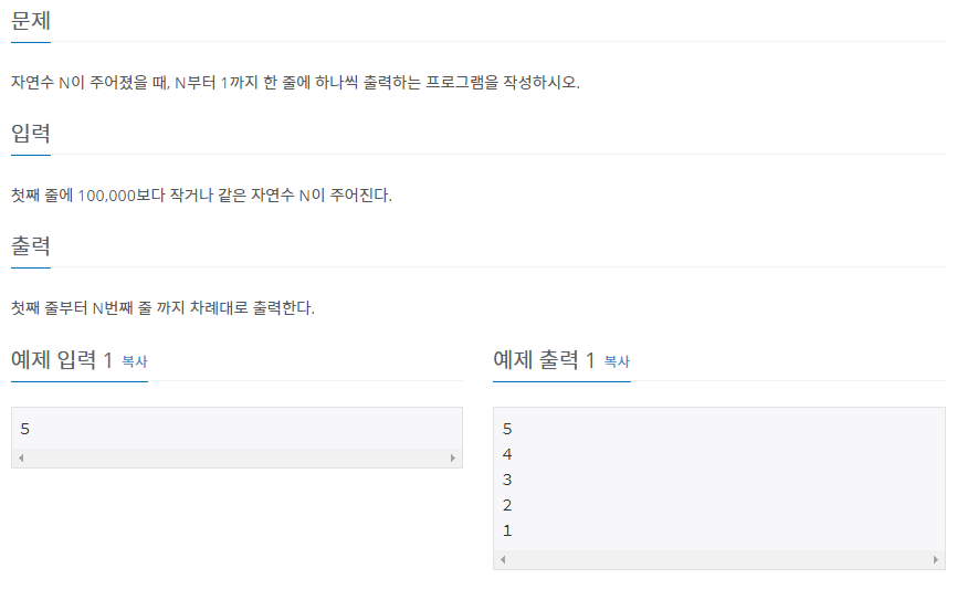 자연수 N이 주어졌을 때, N부터 1까지 한 줄에 하나씩 출력하는 프로그램을 작성하시오.