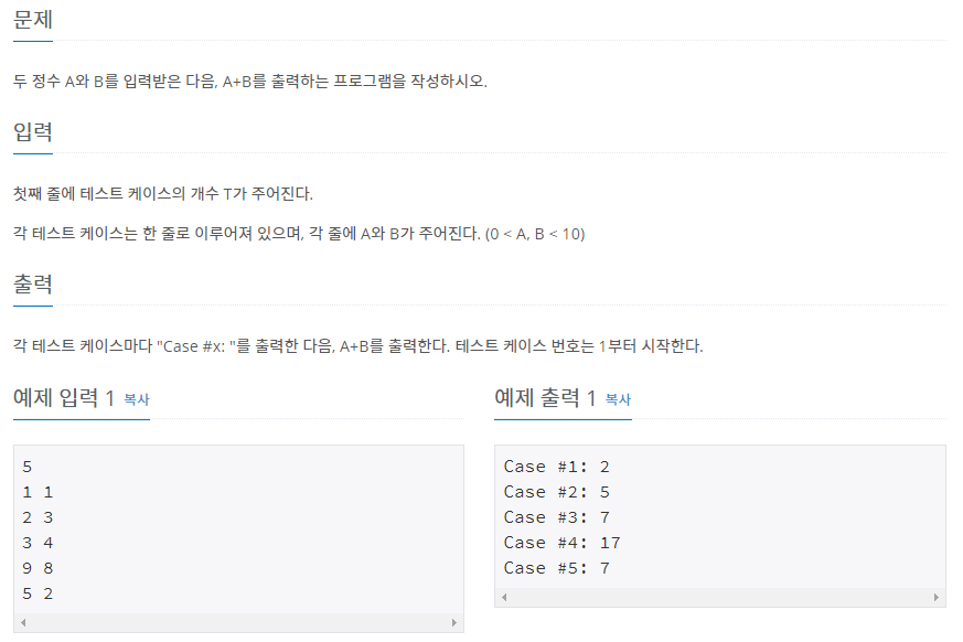 각 테스트 케이스마다 "Case #x: "를 출력한 다음, A+B를 출력한다. 테스트 케이스 번호는 1부터 시작한다.