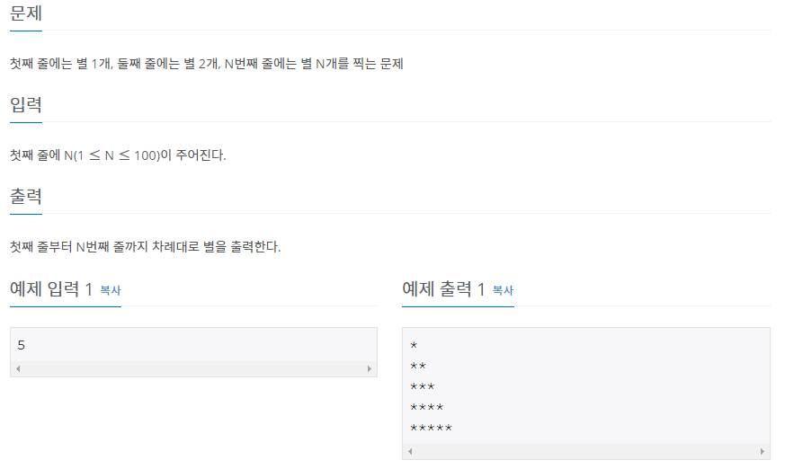 첫째 줄에는 별 1개, 둘째 줄에는 별 2개, N번째 줄에는 별 N개를 찍는 문제