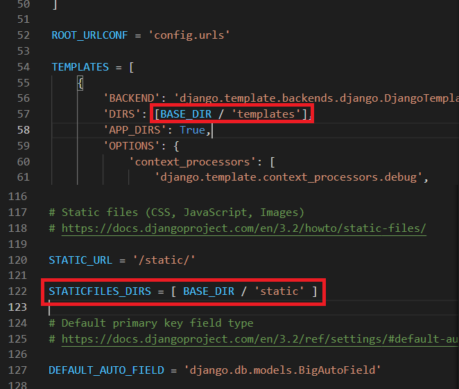 settings.py에 접속하여 templates의 'DIRS'에 위와 같이 입력해주고, STATIC_URL 밑에 해당 식을 입력해줍니다.