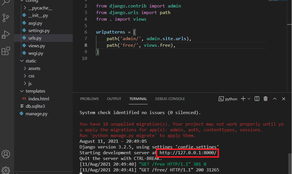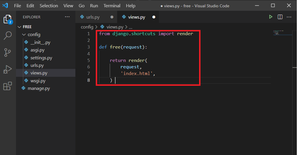 def 함수를 이용해 free를 불러주고, render를 이용해 연결해줍니다.