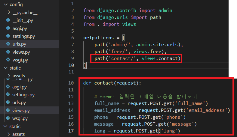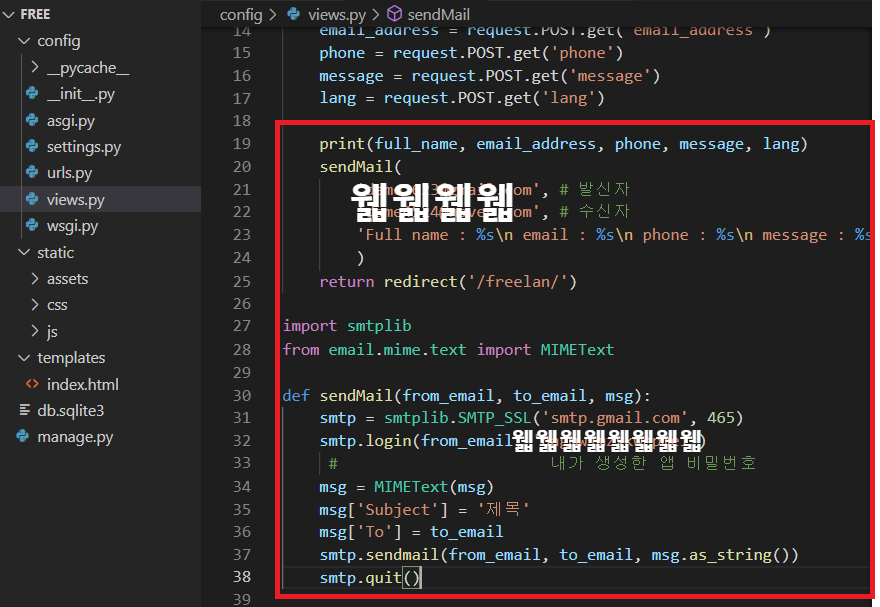 views.py 내에 아래와 같은 코드를 입력해줍니다. 이전 파이썬 수업에서 이메일 연동을 했던 코드를 그대로 차용해서 다시 복습했네요.