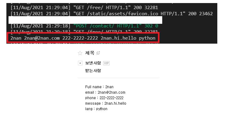 send를 누르면 아래와 같이 Terminal에 내가 입력한 정보가 출력이 되고, 메일을 확인하면 내가 보낸 내용을 받을 수 있습니다.