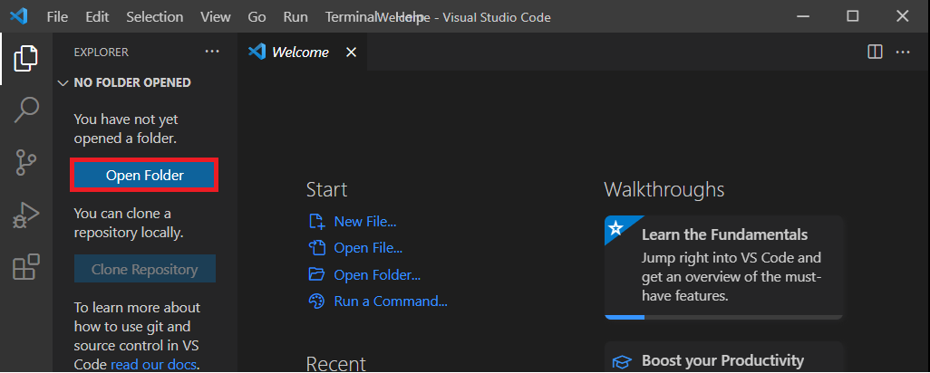 3. Visual Studio Code 실행 후 Open Folder를 통해 생성한 폴더 열기