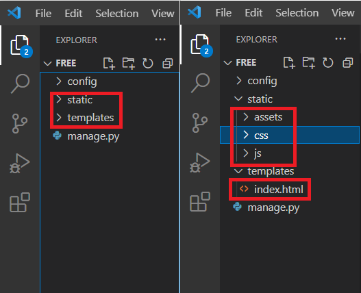 free 폴더 하위에 static과 templates라는 명의 폴더를 생성 후, 아까 다운로드하였던 파일을 안에 복사해줍니다.
