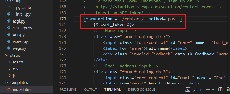 아까 post방식을 이용하기로 했기 때문에, method와 action, 그리고 csrf_token을 입력해줍니다.