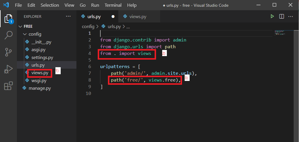 urls.py의 free와 연결 가능한 함수를 생성해주는 단계입니다.
