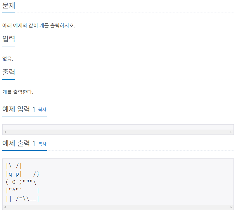 문제 아래 예제와 같이 개를 출력하시오. 입력 출력 예제 입력 1 복사 예제 출력 1 복사 |\_/| |q p| /} ( 0 )"""\ |"^"` | ||_/=\\__|...
