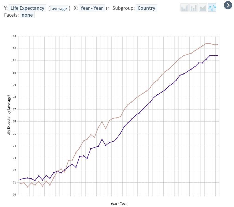다만 중간, 완만하지 않은 초, 중반 구간의 경우 기대 수명의 등락에 대해서 질병 혹은 전쟁 등으로 인한 이유를 들어 유추해볼 수 있지 않을까 생각이 든다.