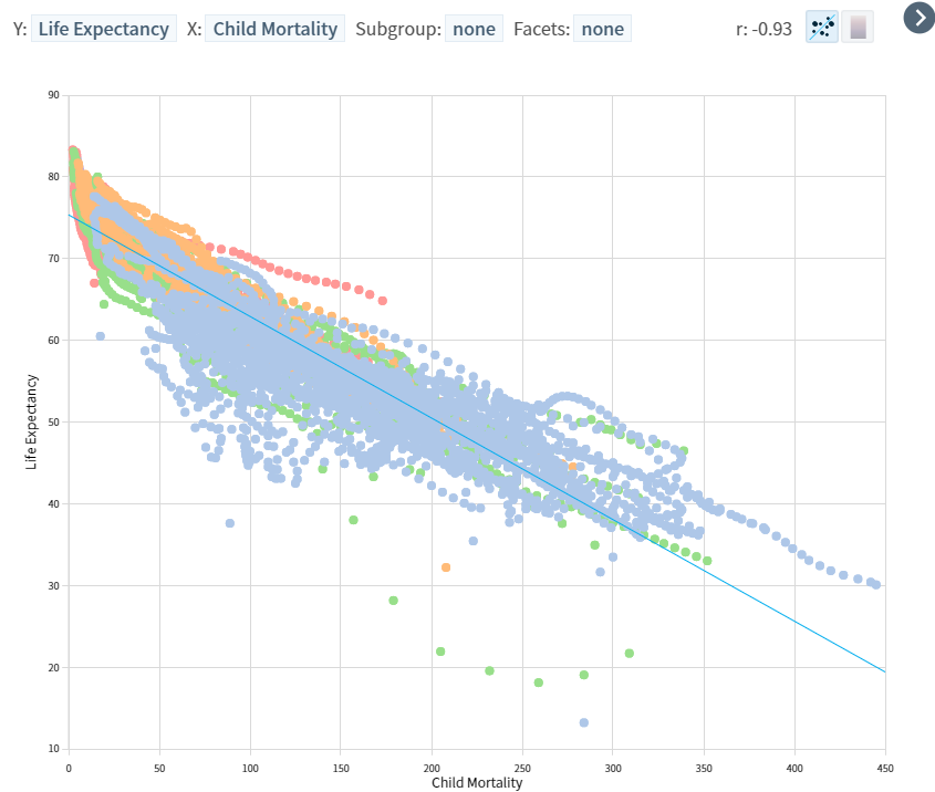 대륙 간 색을 달리 해서 기대 수명과 가장 상관관계가 높은 5세 이하 영유아 1,000명 당 사망자 수와의 관계를 산점도로 표현해봤다. 사망자 수가 늘어날수록 기대 수명이 낮아지는건 어찌 보면 당연한 관계이기 때문에, 대륙 별 분포를 살펴보는 것이 더 의미가 있을 것으로 판단했다.