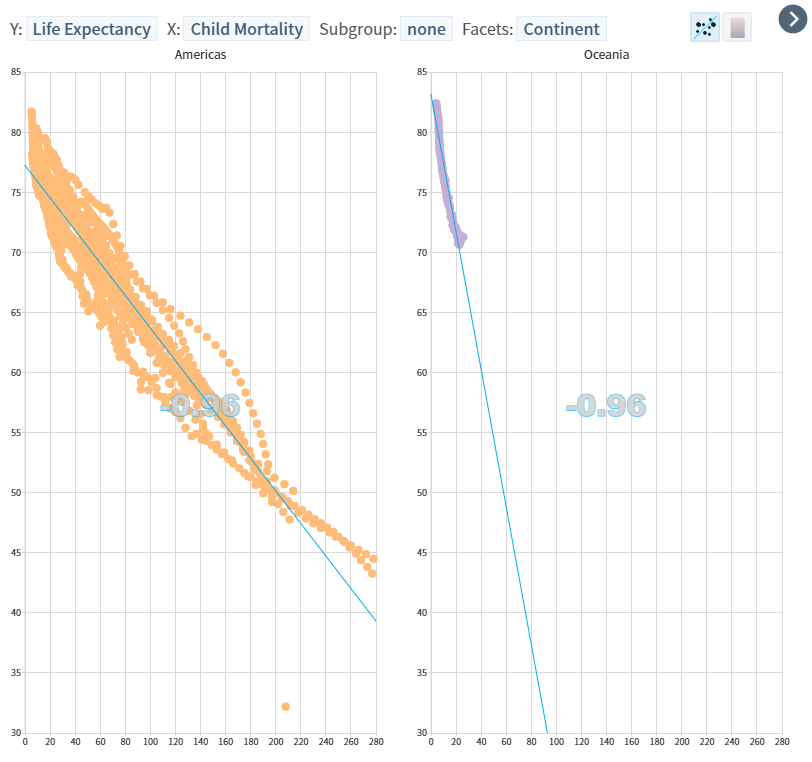 대륙 별로 분할해서 살펴본 결과, Americas / Oceanina 가 각각 0.96으로 가장 높은 음의 상관도를 보이는 것을 확인했다.
