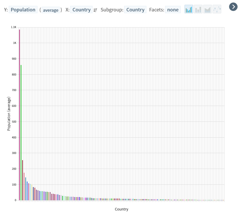 Bar chart로 국가 별 평균 인구 수를 내림차순으로 시각화를 해보았다. 국가 수가 워낙 많아 해당 국가의 정보를 마우스를 올려두지 않는다면 한 눈에 파악하기 어려웠다. 다음에는 데이터를 축소해서 별로 차이가 없고 변화가 크지 않으며 적은 데이터들은 배제하고 상위 10 ~ 20개의 데이터만 시각화해서 해당 국가의 정보도 한꺼번에 볼 수 있는 방향으로 하는 것이 중요할 것 같다.