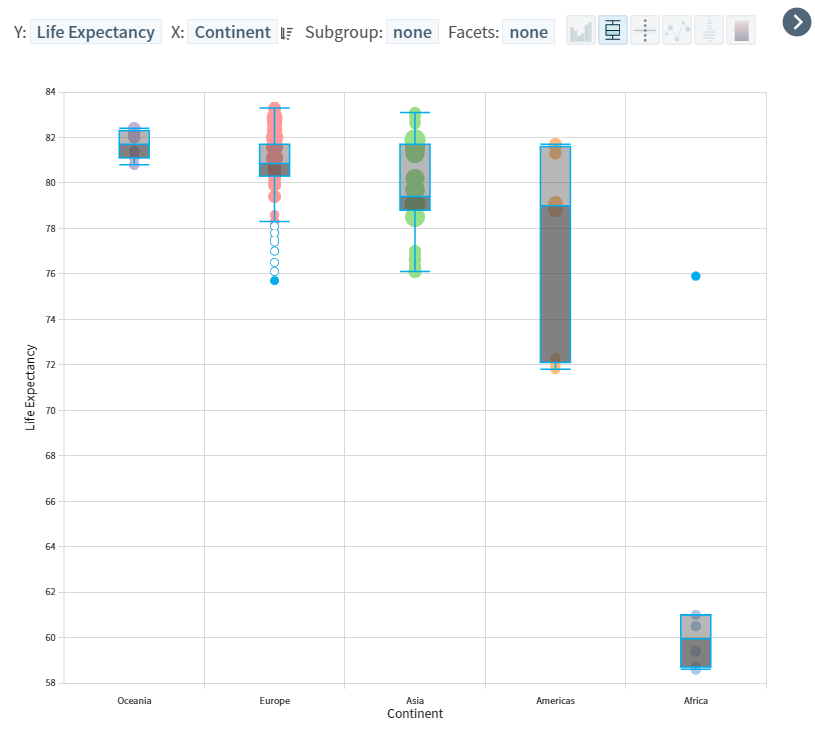 오세아니아의 경우 최소값과 최대값의 차이가 크지 않았다. 반면 유럽의 경우, 1분위 수와 3분위 수의 간격은 오세아니아와 비슷하지만, 최소값과 최대값 간 차이가 큼을 알 수 있다. 또한 최소값 이하의 값(이상치)가 다소 존재하는 데이터로, 가장 데이터가 많은 대륙이기 때문에 이러한 결과값이 나왔을 것이라는 유추를 해봤다.