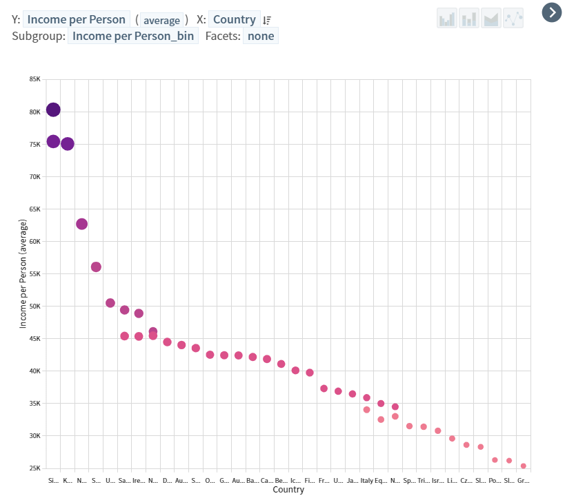 이 또한 위의 Bar chart의 문제점과 비슷한 것 같다. 가장 높은 평균 소득을 가지는 싱가포르, 쿠웨이트 등에 대한 데이터를 이 표만 보고서는 알기 힘들기 때문에, 해당 데이터를 잘 볼 수 있게끔 데이터의 수량을 조절해 시각화를 해야겠다.
