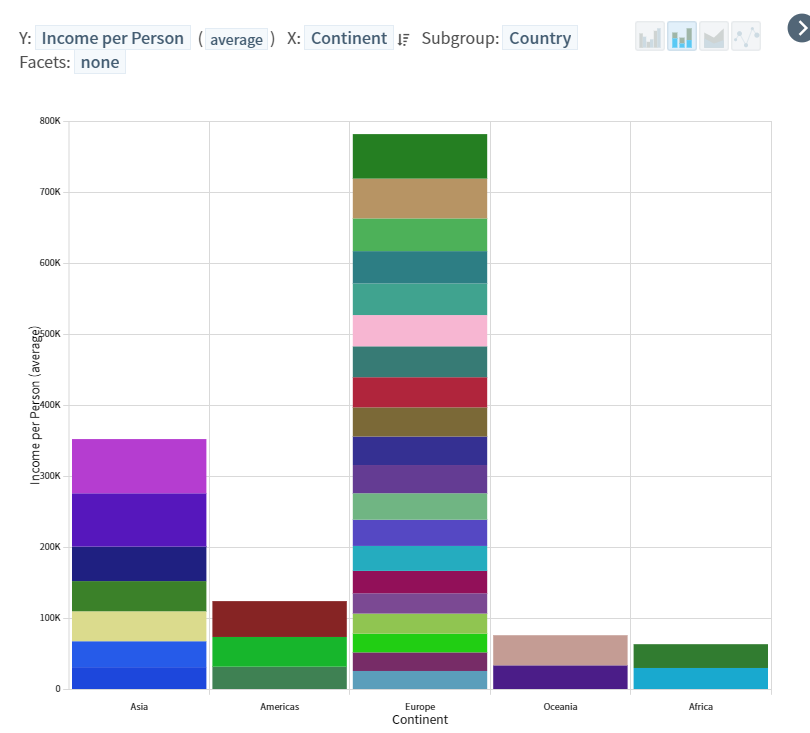 해당 그래프로서 확인할 수 있는 부분은, 평균 소득이 유럽, 아시아, 아메리카 대륙 순으로 높다는 것이다. 다만, 대륙에 속한 국가의 절대적인 수 차이 등 때문에 이러한 결과가 나온 것 같다. (Asia에 한국 데이터는 존재하지 않았던 것으로 기억한다.) 이러한 절대적인 수는 stack된 색을 통해 유추해볼 수 있었다.
