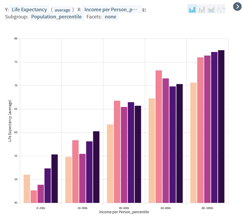 소득 분위가 늘어남에 따라 기대 수명이 높아진다는 것은 당연히 유추해볼 수 있는 결과였다. 다만, 해당 소득 분위 내에서도 인구를 분위수로 나누었을 때, 차이가 생기는데 인구에 대한 분위수를 나누는 기준이 무엇인지 정확하게 모르겠다. 해당 기준을 정확히 안다면, 현재 나타나는 양상에 대해서 조금 다른 인사이트를 얻는게 가능하지 않을까 생각해봤다.