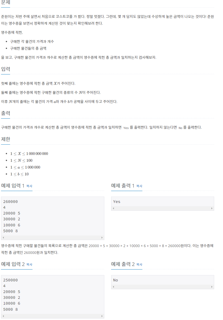 준원이는 저번 주에 살면서 처음으로 코스트코를 가 봤다. 정말 멋졌다. 그런데, 몇 개 담지도 않았는데 수상하게 높은 금액이 나오는 것이다! 준원이는 영수증을 보면서 정확하게 계산된 것