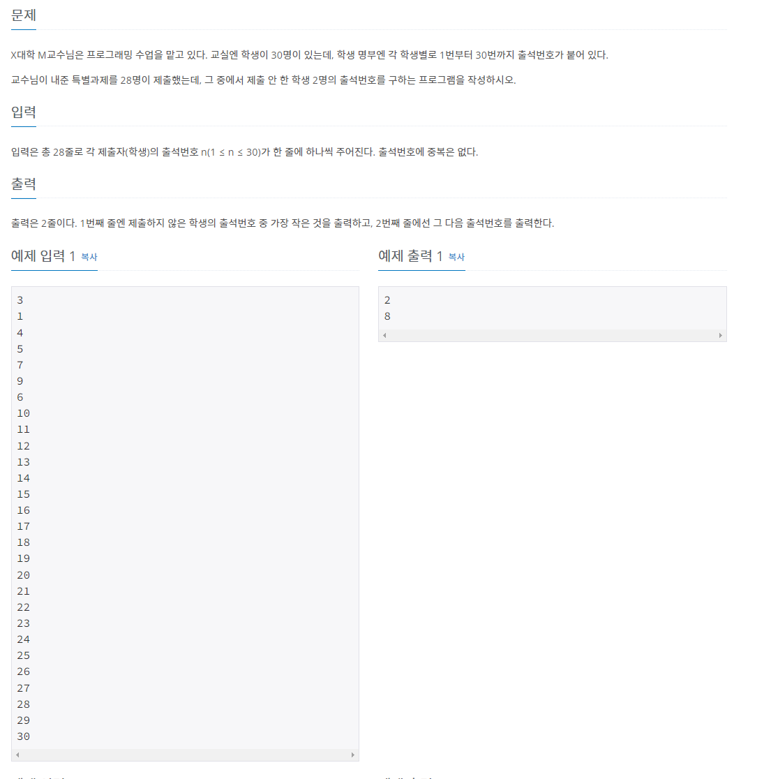 X대학 M교수님은 프로그래밍 수업을 맡고 있다. 교실엔 학생이 30명이 있는데, 학생 명부엔 각 학생별로 1번부터 30번까지 출석번호가 붙어 있다. 교수님이 내준 특별과제를 28명이 제출했는데,