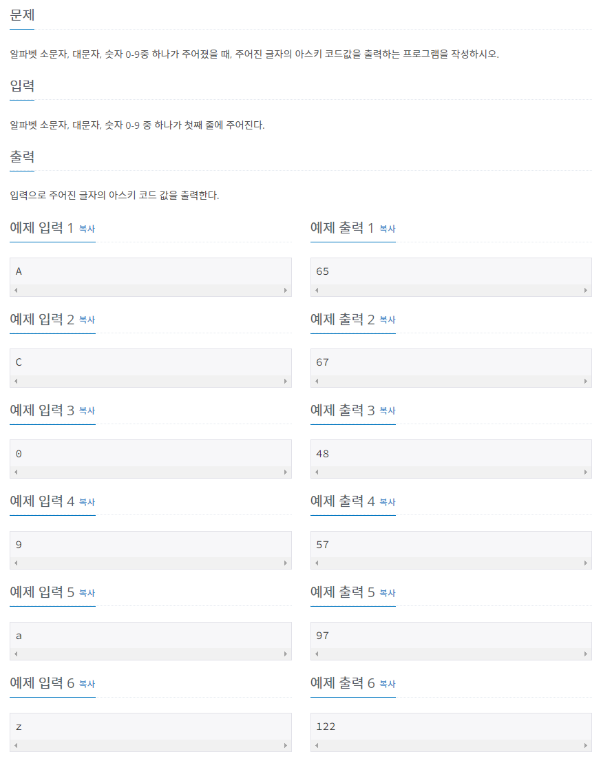 알파벳 소문자, 대문자, 숫자 0-9중 하나가 주어졌을 때, 주어진 글자의 아스키 코드값을 출력하는 프로그램을 작성하시오.