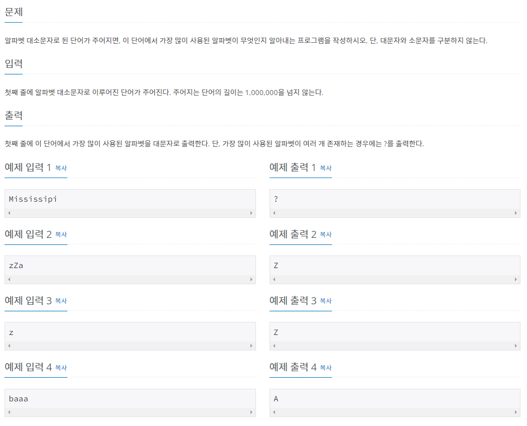알파벳 대소문자로 된 단어가 주어지면, 이 단어에서 가장 많이 사용된 알파벳이 무엇인지 알아내는 프로그램을 작성하시오. 단, 대문자와 소문자를 구분하지 않는다.