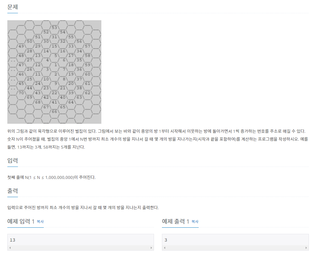 위의 그림과 같이 육각형으로 이루어진 벌집이 있다. 그림에서 보는 바와 같이 중앙의 방 1부터 시작해서 이웃하는 방에 돌아가면서 1씩 증가하는 번호를 주소로 매길 수 있다. 숫자 N이 주어졌